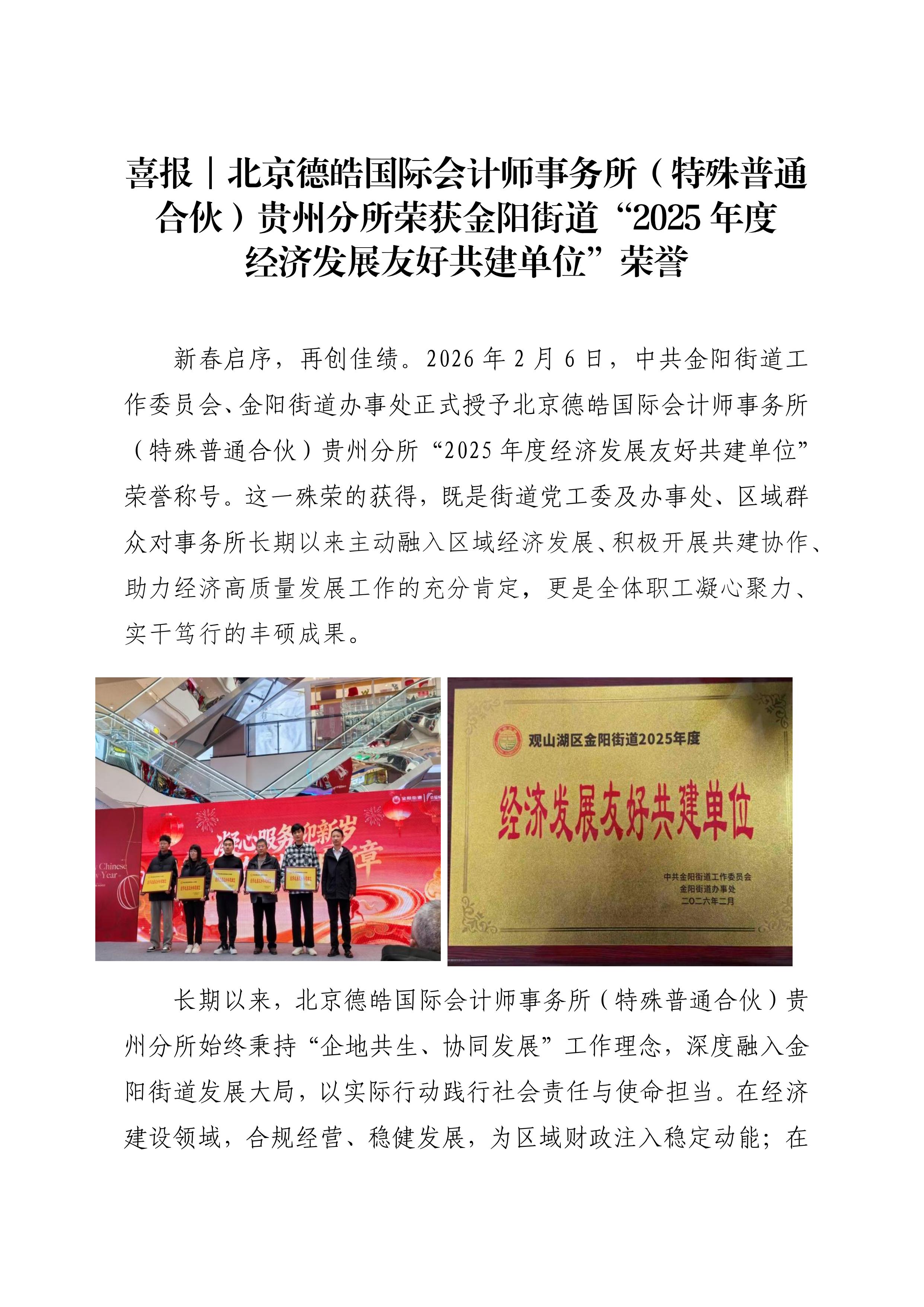 喜报|北京德皓国际会计师事务所(特殊普通合伙)贵州分所荣获金阳街道“2025 年度经济发展友好共建单位”荣誉